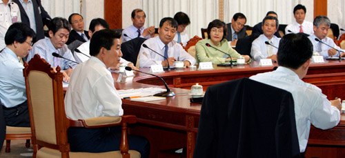 | ▲ 노무현 대통령이 7일 청와대에서 열린 중앙언론사 보도·편집국장 간담회에서 정치관련 질문에 답변하고 있다. ⓒ연합뉴스/백승렬 기자 | ||