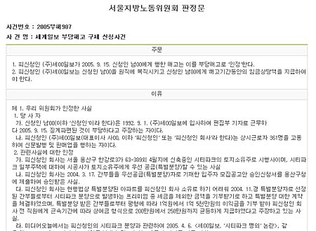 | ▲ 중앙노동위원회 홈페이지에 실린 남창룡 기자 관련 판정문. | ||