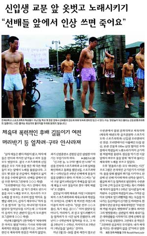 한겨레가 고질적인 문제로 지적돼 왔던 체육대 폭력을 적나라하게 다뤘다. 한겨레는 <신입생 교문 앞 옷벗고 노래시키기 / "선배들 앞에서 인상 쓰면 죽어요">라는 1면 머리기사에서 선배들의 강요에 못 이겨 신입생들이 팬티 차림으로 학교 정문 앞에 서서 노래를 부르는 체대생들의 실태 등을 보도하며 체대의 폭력행위가 일정 수준을 넘어섰다고 보도했다.