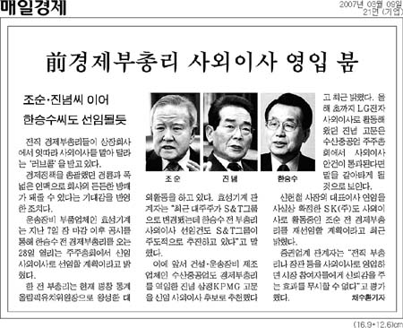 주인공은 조순·진념·한승수 전 경제부총리들이다. 한승수 전 경제부총리는 운송장비 부품업체인 효성기계의 신임 사외이사로 선임될 예정이다. 진념 전 경제부총리도 최근 건설ㆍ운송장비 제조업체인 수산중공업의 신임 사외이사 후보로 추천됐다. 진 전 경제부총리는 올해 초까지 LG전자 사외이사로 활동했다. SK(주)도 사외이사로 활동중인 조순 전 경제부총리를 재선임할 계획이라고 최근 밝혔다.
