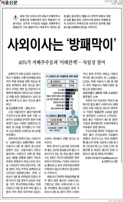 서울신문은 "아직도 지연·학연 등 친분이나 이해관계 때문에 사외이사로 선임되고 있다"면서 "이들의 역할 또한 기업 경영보다는 로비 등 외부활동을 염두에 두고 있는 것으로 풀이된다"고 전했다.