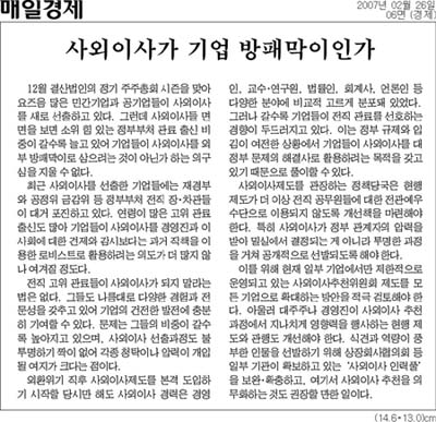 이들의 면면을 통해 '추론'할 수 있는 것은 사외이사 제도가 기업경영 투명성을 높이는 장치로 기능하기보다는 오히려 로비를 고려한 창구로 활용될 가능성이 높다는 점이다. 전 경제부총리의 사외이사 영입붐이 일고 있다고 오늘자(9일)에서 보도한 매일경제도 지난달 25일자 사설에서 바로 이 같은 문제점을 지적하고 있다.