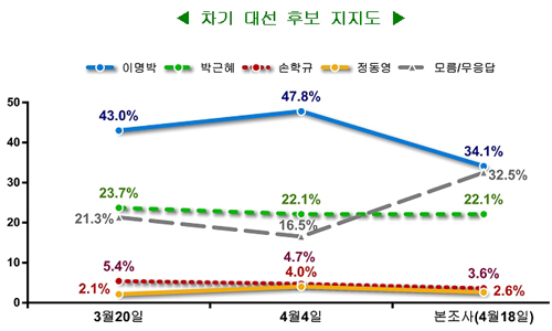 이 전 시장은 34.1%를 기록해 박근혜 전 대표의 22.1%보다 앞섰지만 두 사람의 지지율 격차는 12%P로 줄어들었다. 손학규 전 경기도지사 3.6%, 정동영 전 열린우리당 의장 2.6%, 한명숙 전 총리 1.6%, 강금실 전 법무부장관 1.5%, 노회찬 의원 1.2% 등이 뒤를 이었다.