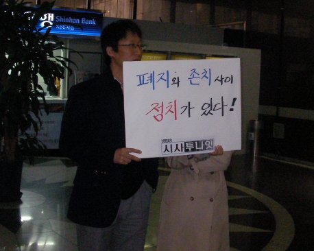 | ▲ KBS PD 20여명이 31일 낮 12시 서울 여의도 KBS 신관 2층 로비에서 <생방송 시사투나잇> 사실상 폐지 개편안의 철회를 요구하며 팻말시위를 벌이고 있다. 조현호 기자 chh@ | ||