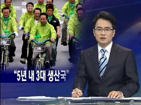 KBS는 이어 14번째 리포트 '이 대통령 "5년 내 3대 생산국"'에서 "오늘은 대통령도 자전거를 타고 함께 달렸다"며 "세계 3대 자전거 국가로, 자전거 산업을 키우겠다고도 약속했다"고 소개했다.